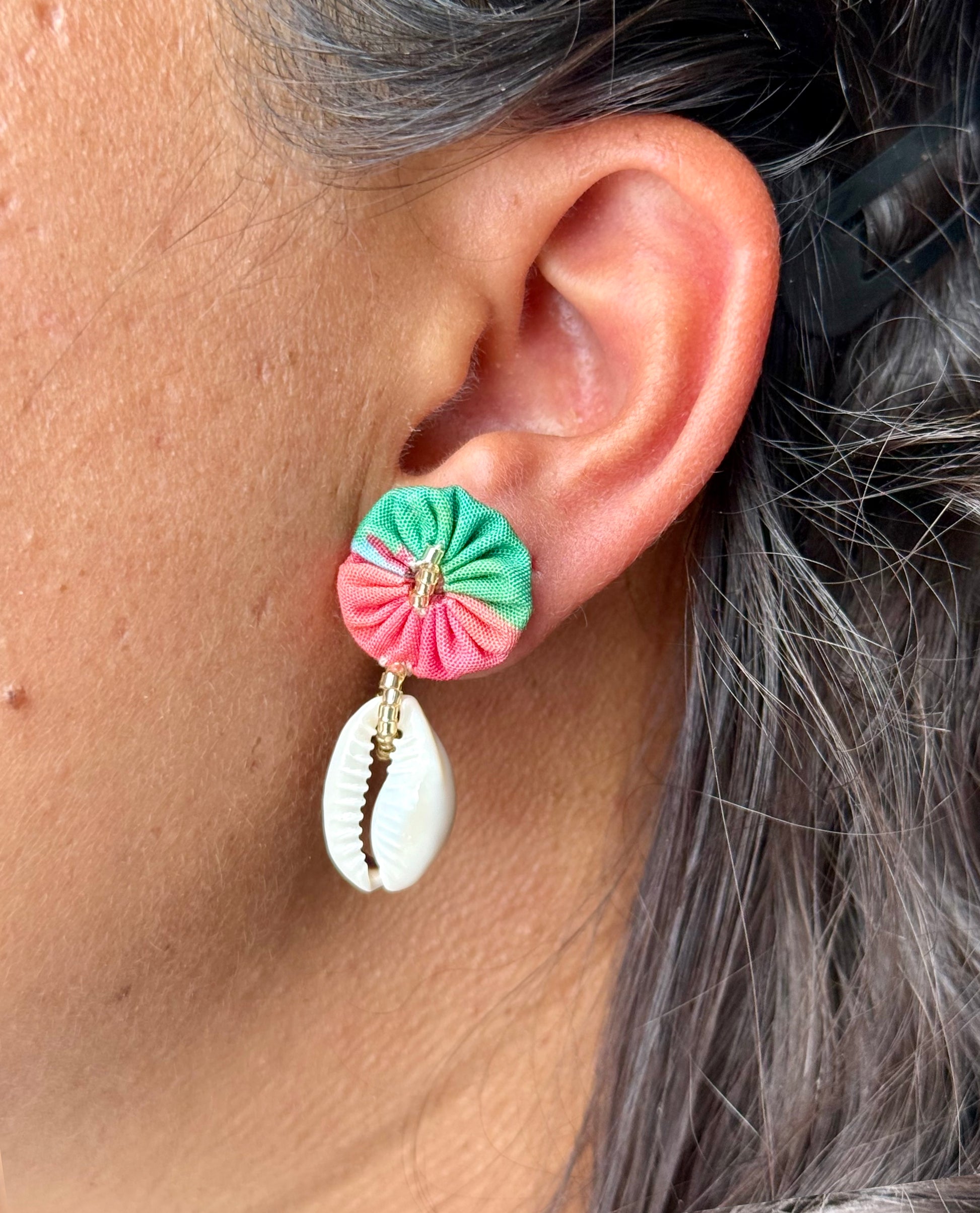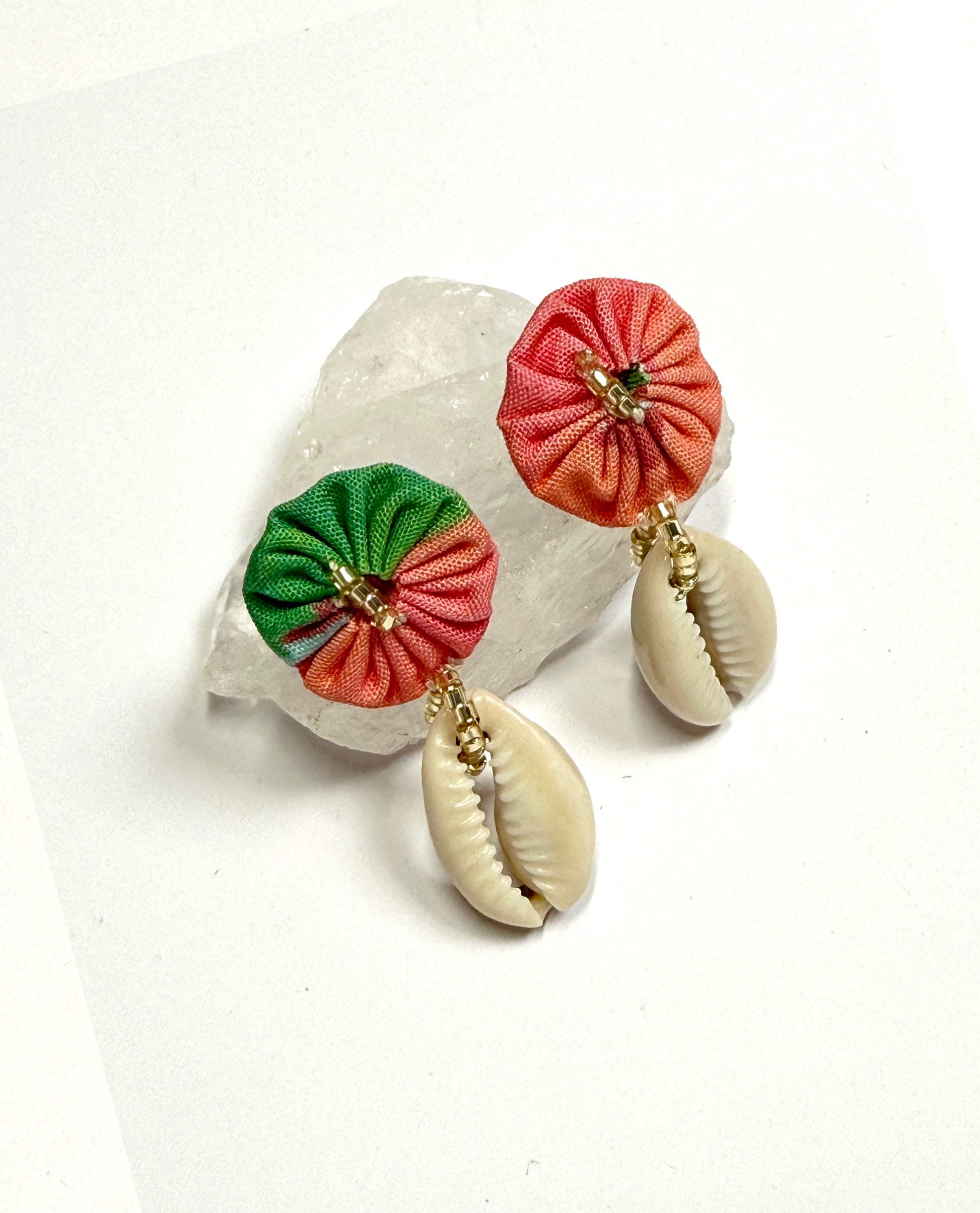 🌞Boucles d'oreilles avec attache en acier inoxydable, rosace en tissus imprimĂ© de mon illustration, perles de verre et coquillage.  Â